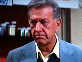 Quincy goes to the Zagner Pep Shop next. The sign tells us he sells 100% legal stimulants and takes phone AND mail orders. Zagner, played by QUINCY go-to guest baddie Simon Oakland, is overheard selling 50 "Redbirds" to a woman for $22.50. He swears by their safety, and even takes the pills himself, so Oakland (67 at the time and looking every bit of it) might well qualify as the world's oldest drug dealer AND user. He sells T-shirts as well, has the American flag all over his store, and has one sweet ride that we see out front. Just to hammer the point home that he's still a bad man, the license plate reads "SPEED 99". Quince winces with disgust at the fact that the man is becoming quite successful over the dead bodies of teens (or possibly because Zagner's car is so much nicer than the Big Q's brown station wagon).