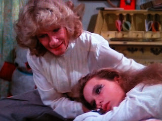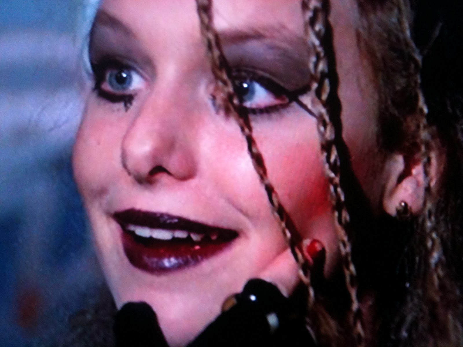 For some reason Mom's pep talk infuriates Hardin, and Cason flees as her daughter declares that she hates her. We fade out on the chilling sight of Hardin punkin' up her face further with red numbers while shouting along with Mayhem in front of her mirror. Fade out on a tight closeup of her angry face. Gee, I wonder if there's a message here.