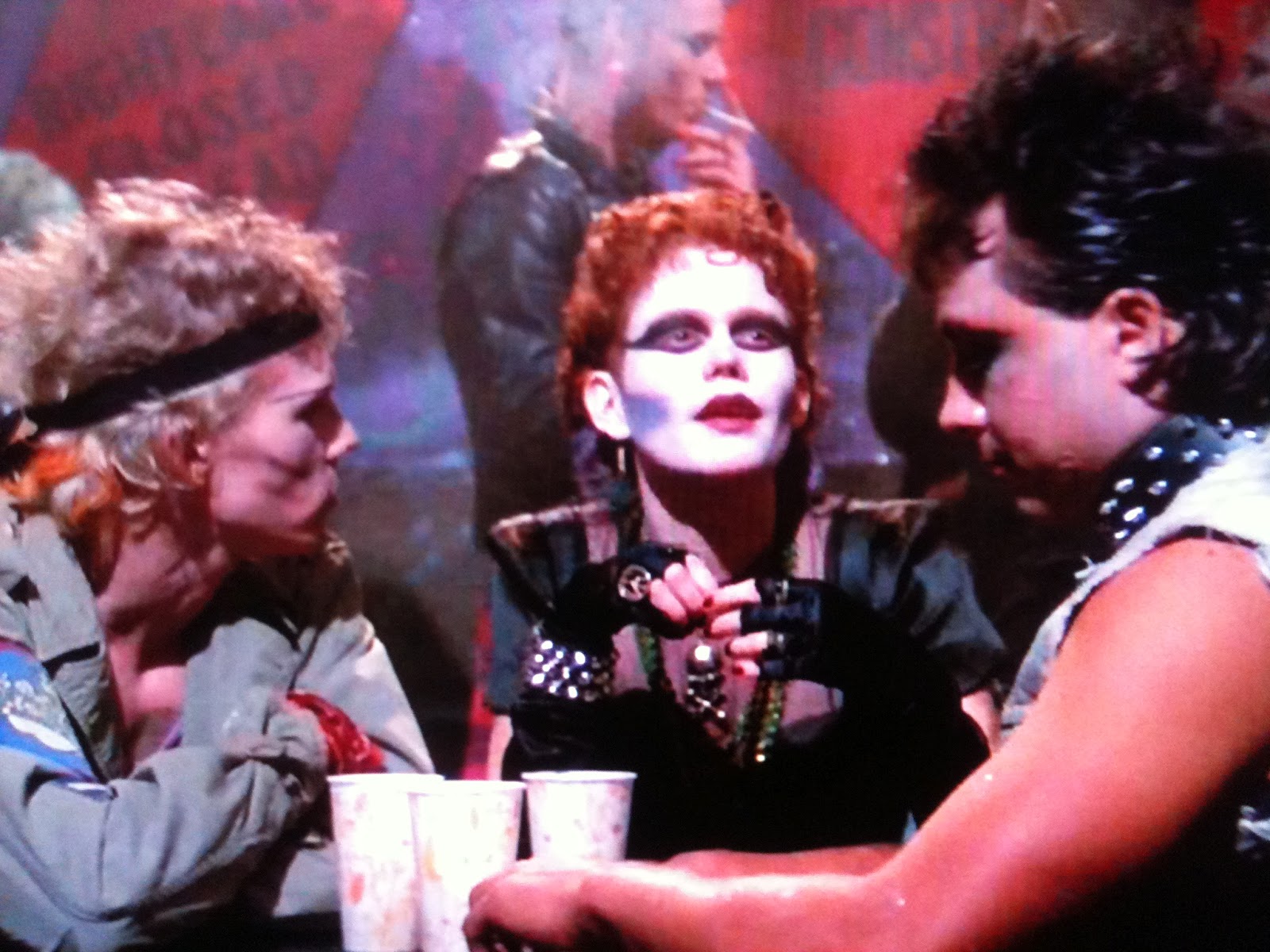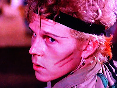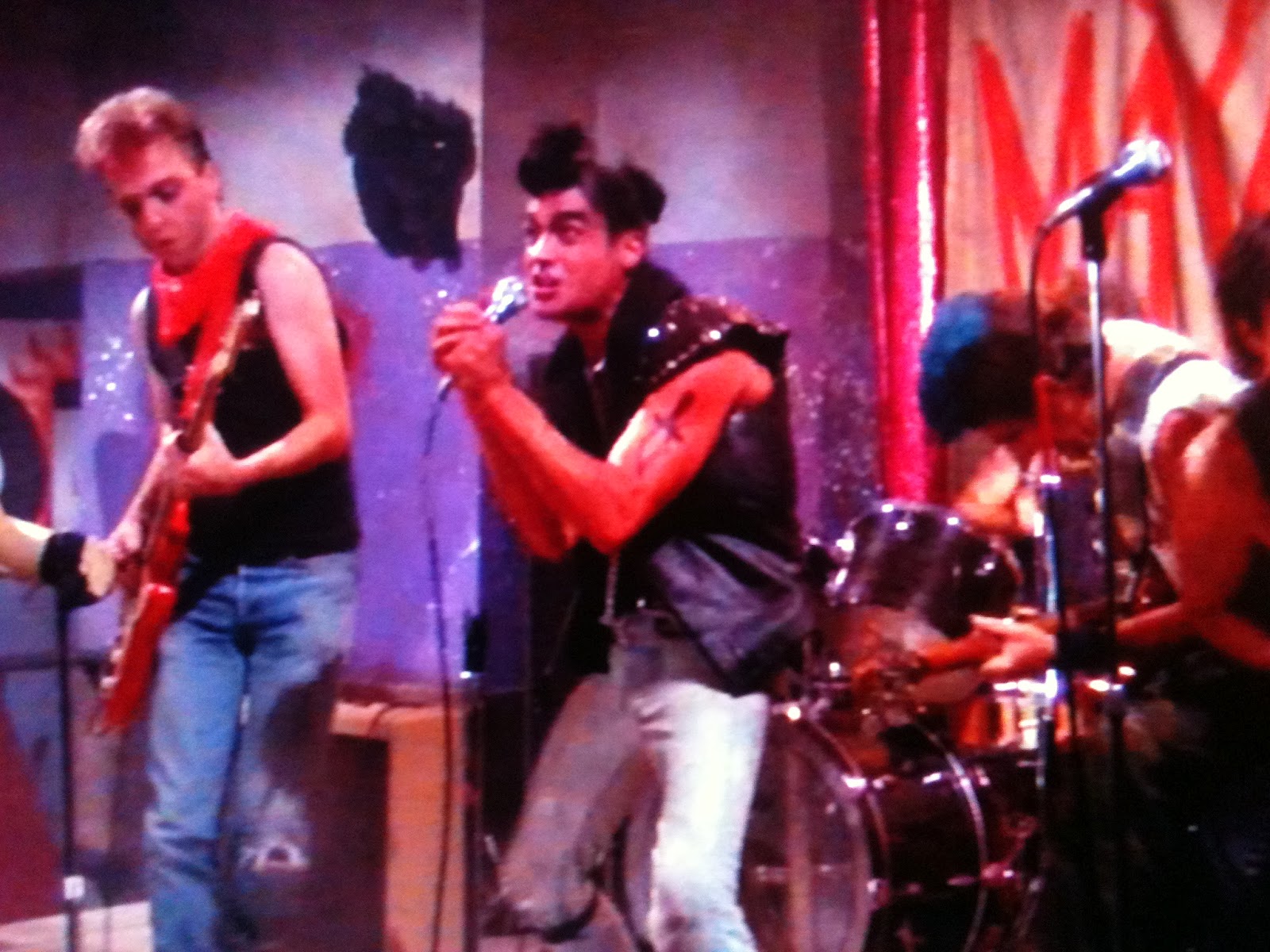 Wow, you'd never guess those lyrics were written by a prime time staff writer...... anyway, during the subsequent slam dancing, Hardin's boyfriend Ward gets pushed around a little too much for his liking, and pulls out a switchblade. He's poised to strike, and we sense disaster, but a curve is thrown as the knife is knocked out of Ward's hand, falls to the floor, and the now unarmed punk subsequently receives an ice pick to the neck and collapses. Yup, there's at least two weapons out there, probably more! Ward lies unnoticed by the unfeeling, uncaring punks colliding around him. The exception is Hardin, who screams his name as she's swept away in the mayhem in front of Mayhem.
