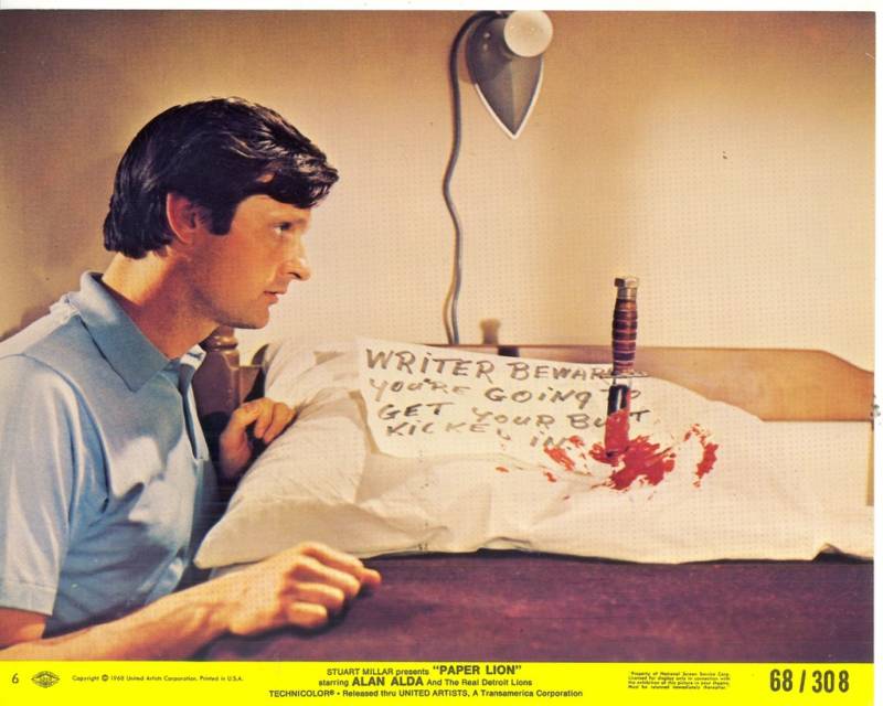 PAPER LION (1968 United Artists) Starring Alan Alda, Lauren Hutton, Joe Schmidt, David Doyle, Alex Karras, Karl Sweetan, Pat Studstill, Milt Plum, Roger Brown, John Gordy, Lem Barney, Frank Gifford, Vince Lombardi, Mike Lucci. Directed by Alex March. Written by Lawrence Roman (from the book by George Plimpton).