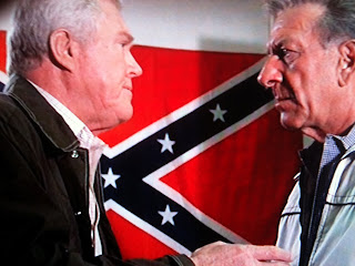 Anyway, Dirty Harry Hellworth tries the Sgt. Schultz defense to no avail, as Q and Giovelli have a search warrant and the threat of a murder charge ready to go. Hellworth caves faster than his Confederate compadre and agrees to take them to the dumping site. Once there, Hellworth panics, and not because Giovelli plans to "hang him up by his thumbs" and make an example of him. Rather it's because of his discovery that Hank's latest delivery "ain't here". Finding Mickey is a priority now, because Giovelli informs us that if the phosphorus trichloride comes in contact with moisture, the result could be catastrophically deadly. Right on cue, thunder rumbles ominously (there's that word again) in the overcast sky.
