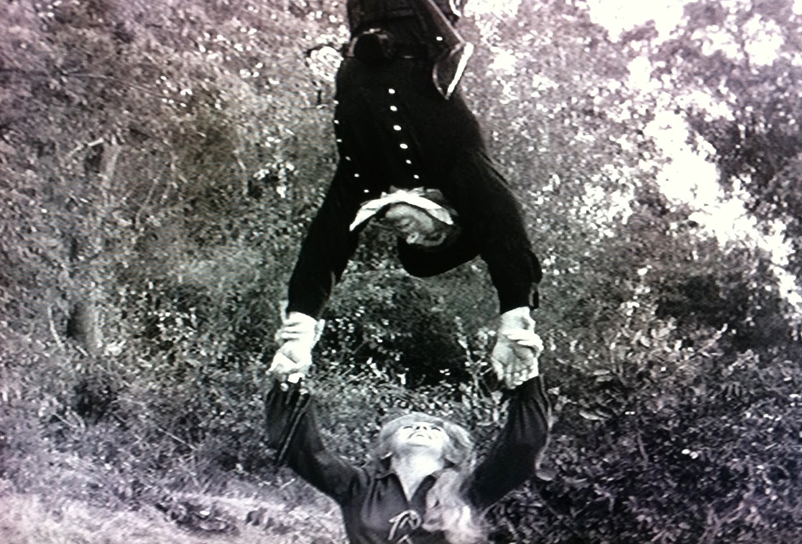Granted, he isn't missing by much, but this is a practically stationary target, paralyzed with fear. Either that was a lucky shot earlier at the camp, or the great Geronimo is choking in the clutch when presented with a breathing bull's eye. While Randolph is looking slightly less than heroic in this confrontation.....