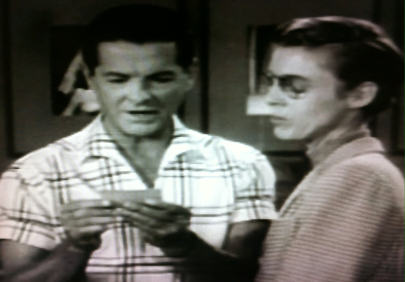 The real Bill Lear was a friend of Cummings (also a Missourian) and inventor (Learjet, the 8-track tape). The fictional Lear first appeared as a would-be suitor for Margaret in Bob Meets Bill Lear, but his social ineptitude is almost painful this time. He appears to have a chance of his own with Cecily at first, but proceeds to blow it as he tells her all about Bob's past escapades--things he thinks will make her "downright hate him". Of course these stories have the opposite effect. By episode's end, Lear is embarrassingly reduced to spiteful cock blocking alongside Miss Livingstone. Best known for starring in DESTINATION MOON (1950), John Archer made multiple appearances as Lear during the final two seasons of LOVE THAT BOB.