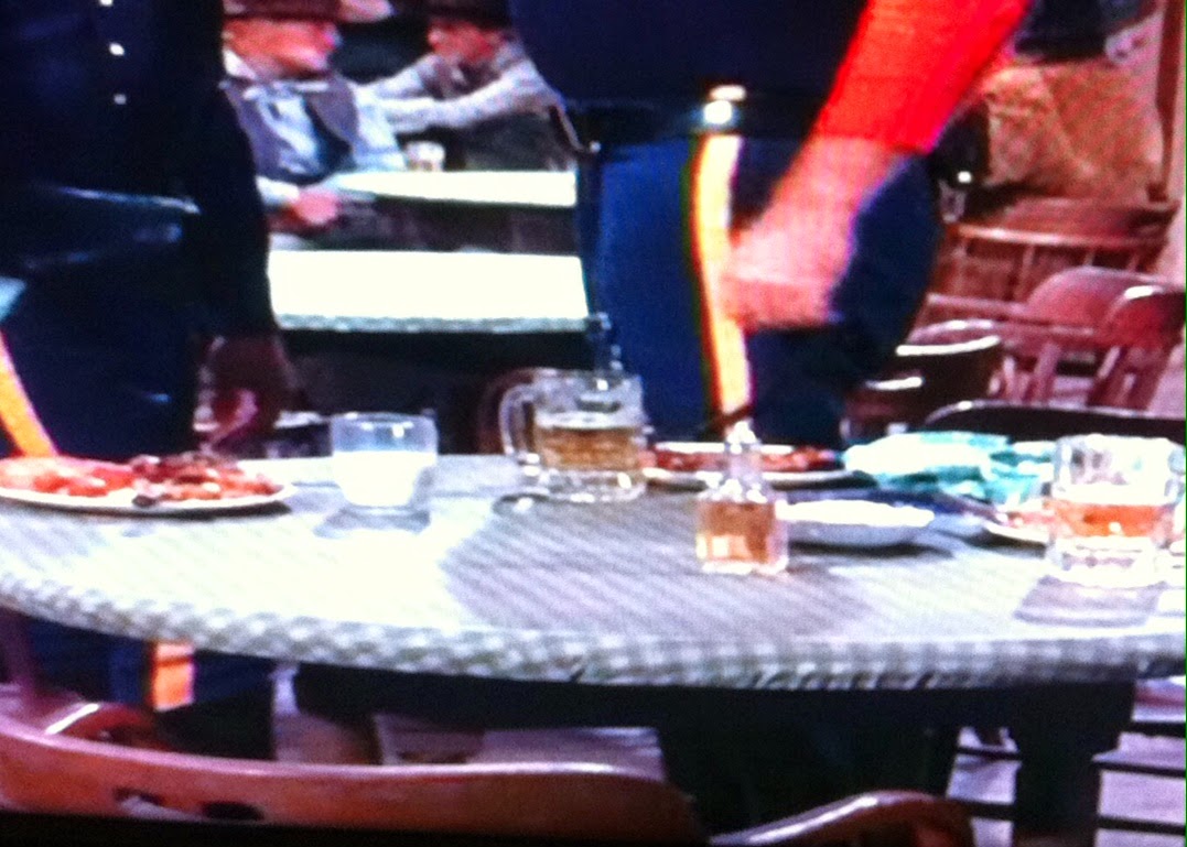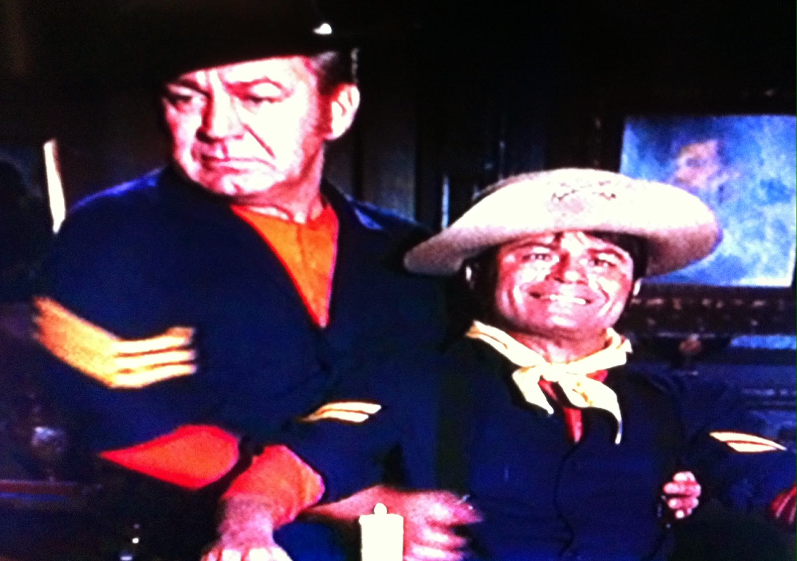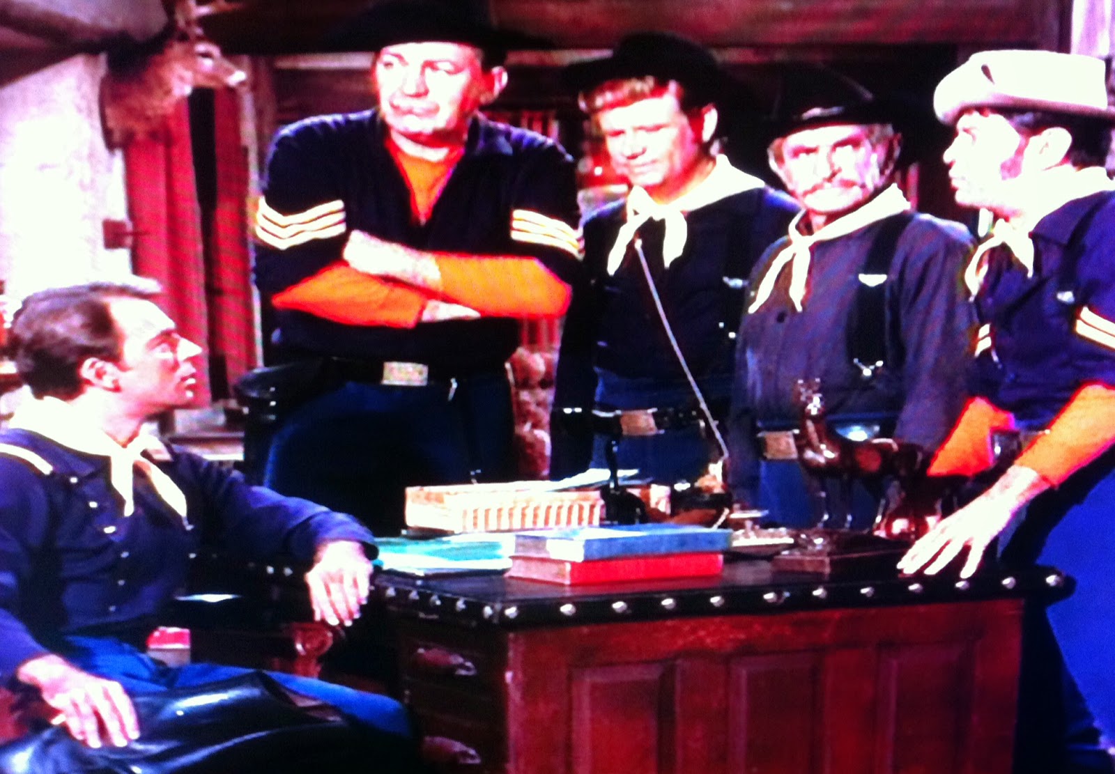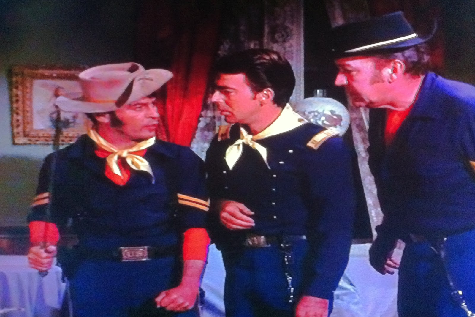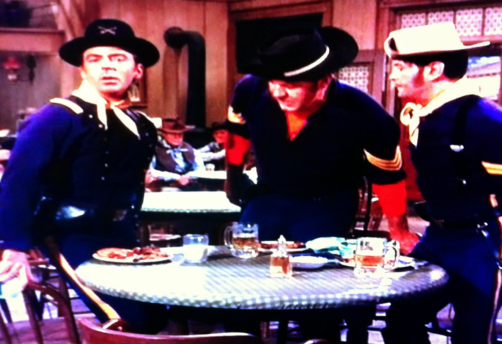 Meanwhile, inside the banquet room (added early in Season Two) of the Fort Courage saloon, Captain Parmenter (Berry), Sgt. O'Rourke (Tucker) and Corporal Agarn (Storch) have foregone the mess hall for the saloon's plate lunch.