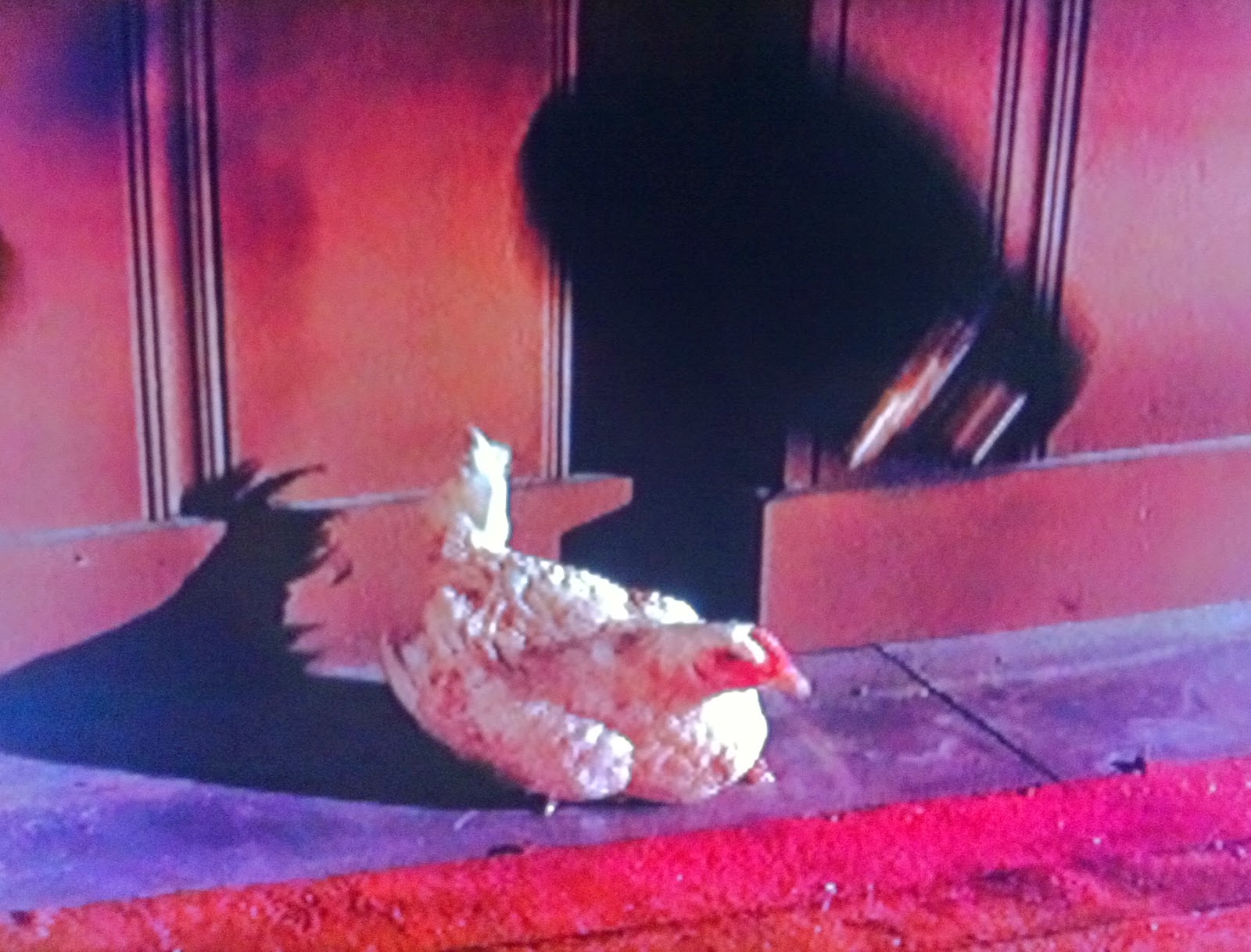 If you guessed downstairs to Corporal Agarn, well, too bad there isn't a prize involved. The Captain's hat appearing to travel down the stairs by itself--just what Randolph needs to see in his current mental state. If Count Sforza "turned his brother into a crow", then he must have just turned Parmenter into a chicken! A deed most fowl, eh?