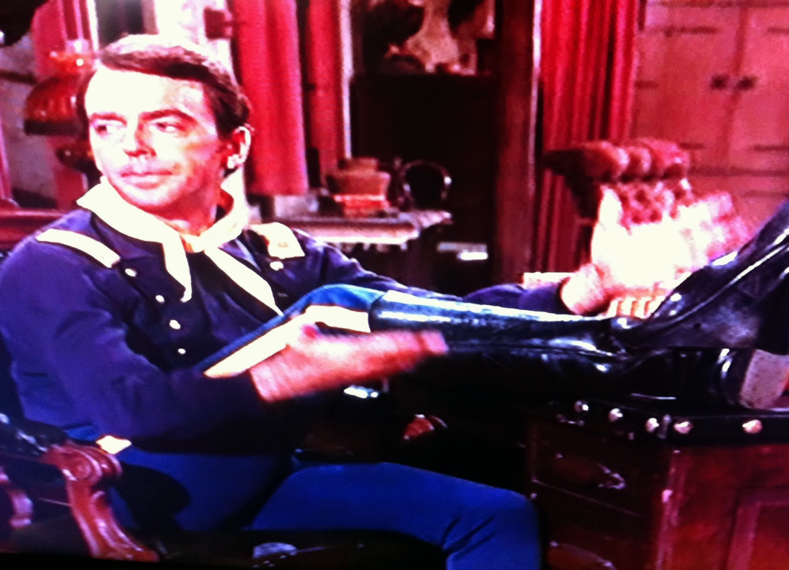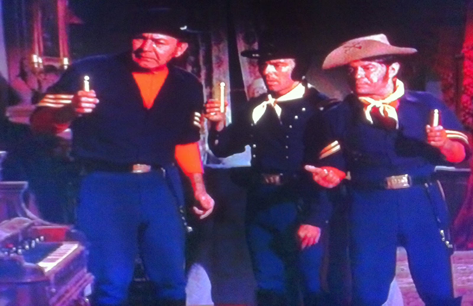 That's wasteful to leave all that food, men. Not to mention the beer! Shame, shame. Once outside, O'Rourke reassures the captain that Fort Courage is devoid of suspicious characters (HA!). Right on cue, our pasty new arrival encounters the men and wishes them a "Good Evening"--in broad daylight.