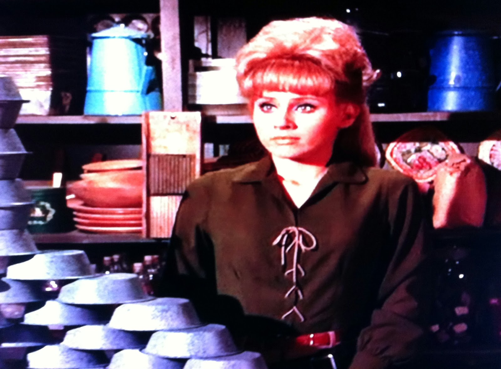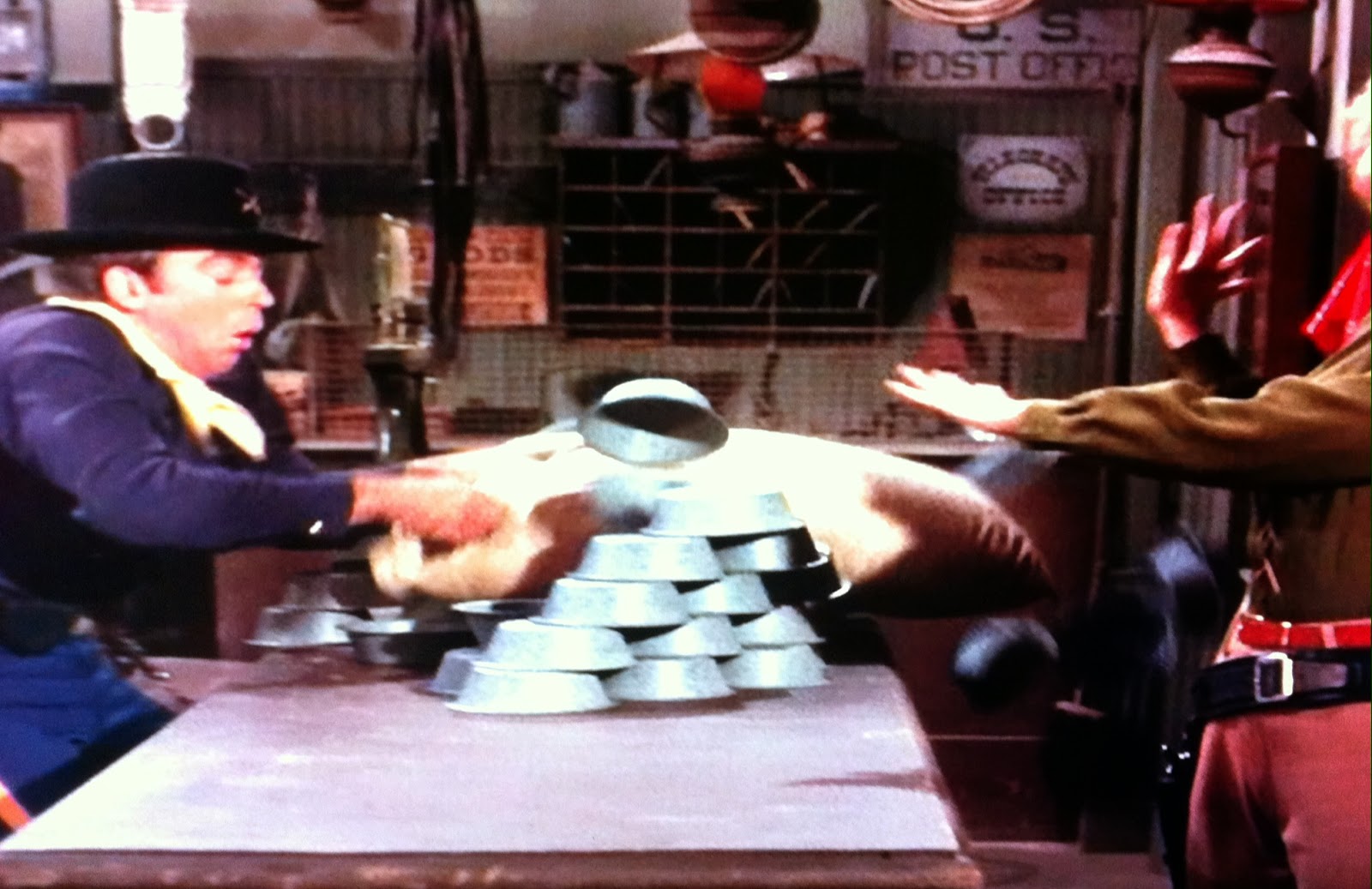 The stranger then walks right into the saloon. We don't get to see if he orders a drink (a Bloody Mary? Nah, too easy) since he isn't followed. Instead we get the opening freeze frame on the reactions by our F Troopers, followed by the theme song and credits. Next stop for the stranger in town is the general store owned by Wrangler Jane (Patterson), who understandably looks a bit uneasy.