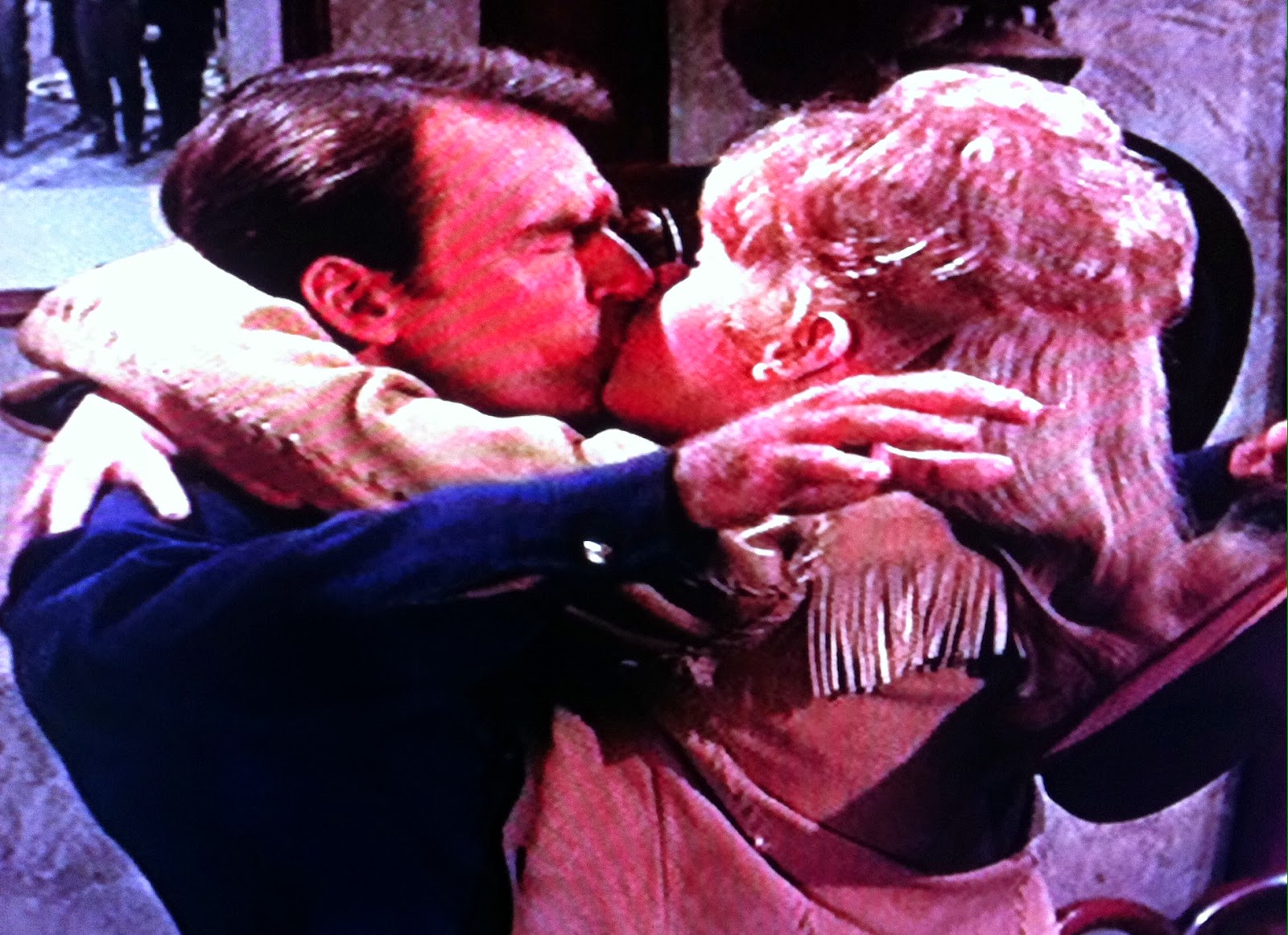 Meanwhile, back at the fort, Jane opens Act II by letting the Captain know she'll be back for their date as soon as she completes her delivery to Count Sforza's creepy, gloomy, spooky house. She asks Wilton if he wants to come along, but the Captain passes (some things didn't change with the move to color) since he's busy taking inventory. Smooth, Mr. Parmenter. Yeah, I'd much rather count postage stamps than spend the afternoon with Miss Thrift.....