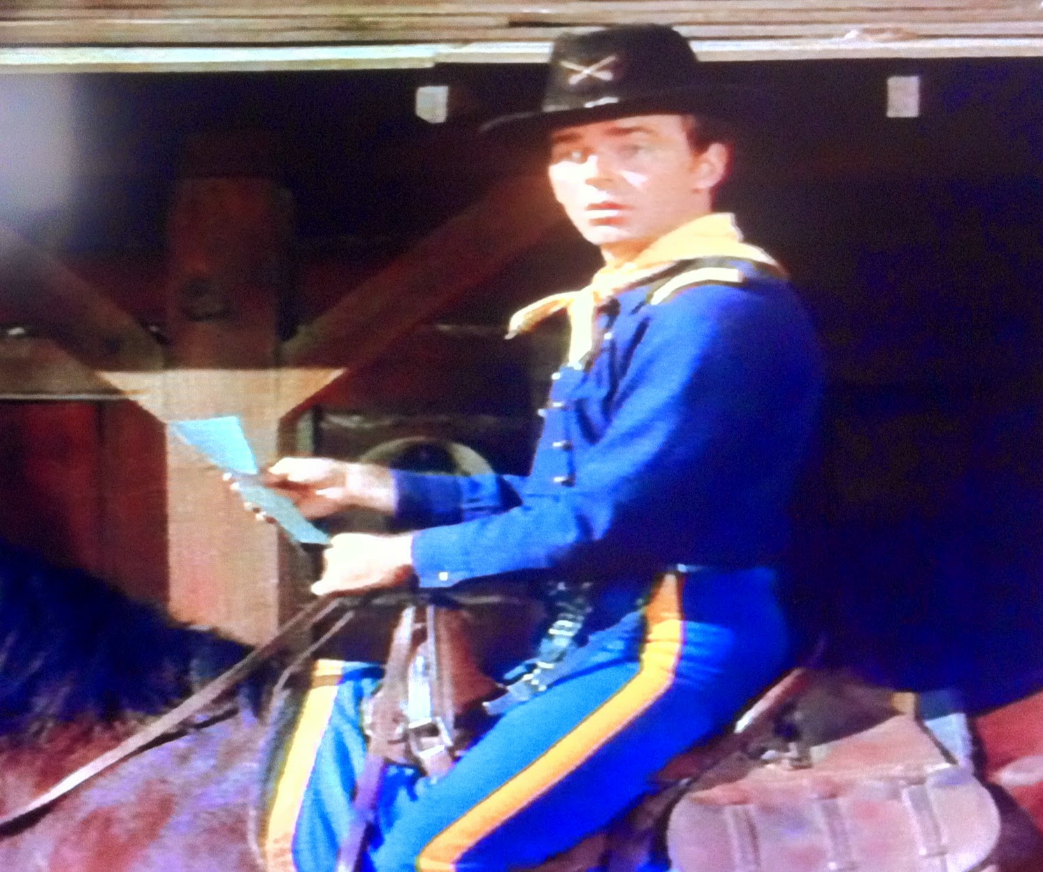 Probably time for a search party, but with the turmoil back at the post, who's going to order it? Wilton feels a renewed sense of urgency to find his way back, since it suddenly strikes him that that "strange looking trooper" (Dobbs: "Which one is that Sir? We have so many.") was in fact Wild Eagle! Eager to get back and check out his hunch, the Captain tries turning navigation over to the horses, who "have the instincts of homing pigeons". That they do. Unfortunately, they are just a wee bit faster than the men are on foot.
