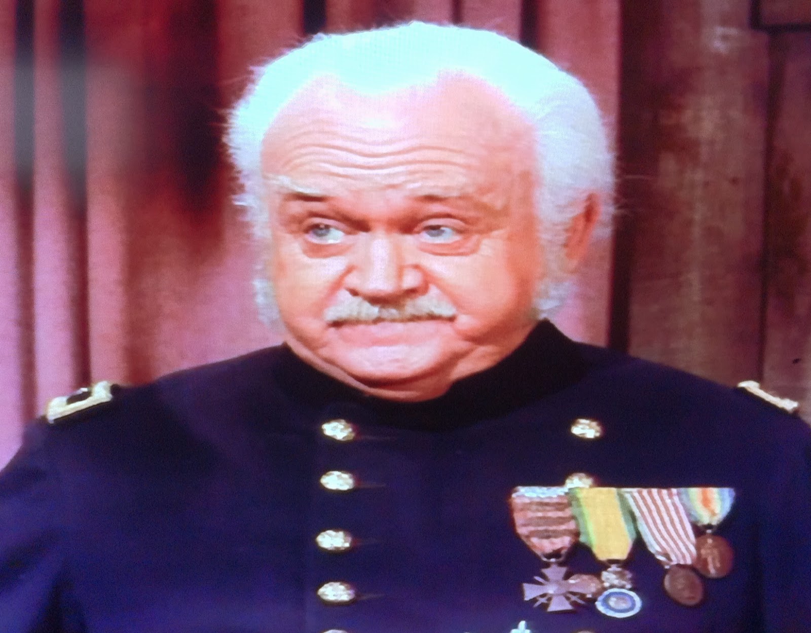 After several years of playing homespun codger Charley Weaver, Cliff Arquette is a perfect choice for equally doddering General Sam Courage, who isn't having any excuses for Parmenter's failure to be present. "A good officer always expects the unexpected!" Of course, no miscommunication can be the fault of a General. "I didn't miss him, he missed ME!" (Our Brave in F Troop would turn out to be Arquette's last non-Weaver acting role; he would continue as Weaver on HOLLYWOOD SQUARES until his death in 1974.)