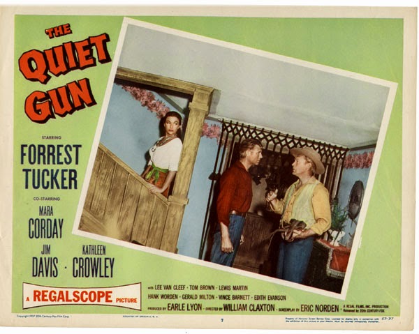 Tuck was still known for playing truculent villains and taciturn heroes when he starred in Fox's RegalScope feature THE QUIET GUN in 1957. (Not for long; his image-changing roles in AUNTIE MAME and THE MUSIC MAN were only a year away.) While his Republic vehicles had bigger budgets and his British science fiction efforts (THE CRAWLING EYE) are better known, for my money THE QUIET GUN is Forrest Tucker's best leading role, period.