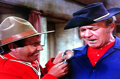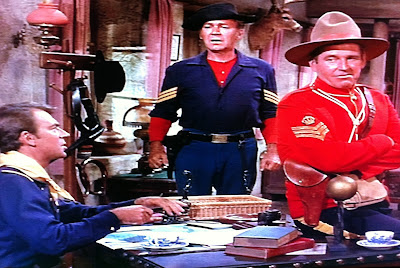 The call to assembly interrupts them, and guest Ramsden gets to repeat that they always get their man. The Mountie then zeroes in on Agarn, giving the Corporal careful study as Parmenter (Berry) gives another awkward address to his men to explain the presence of O'Rourke's Canadian cop counterpart. Ramsden studies slowly, meticulously.....