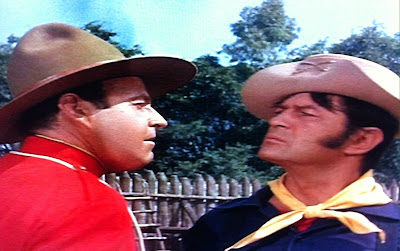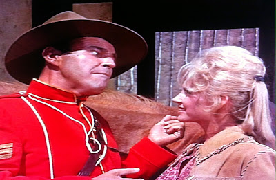 Dobbs' musicianship may still leave much to be desired, but robust singing soon fills the air, with a uniformed Sergeant of the Royal Canadian Mounted Police (Lynde) making a grand entrance, singing "Tramp, Tramp, Tramp" while the dogs pull his sled (outfitted with retractable wheels) into Fort Courage. (While there was a famous Civil War song of the same title, these lyrics belong to the Victor Herbert song--still about forty years away from being written.)