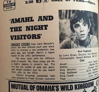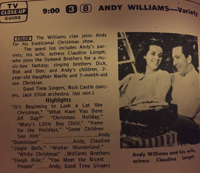 The seasonal mood is being built on Monday night with the annual Andy Williams Christmas show, with Andy's special guests The Osmonds. The aforementioned David L. Wolper also gets a TV Guide Close-Up for his ABC documentary airing at 10:00, In Search of Man. Van Heflin narrates.